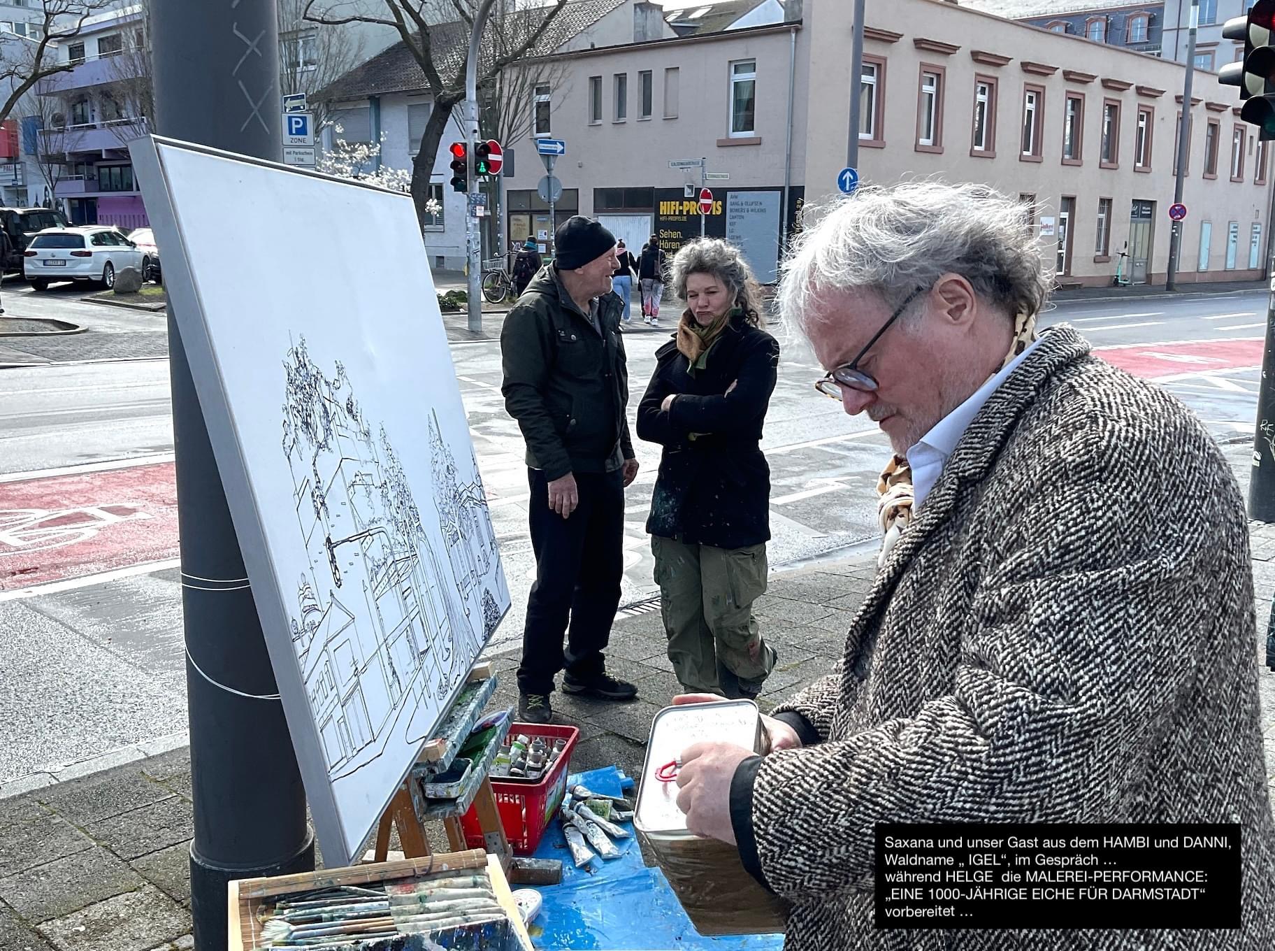 Wir kamen im November 2019 hinzu und setzten mit unserer Malerei ein entsprechendes Statement. Wir portraitierten die ALTE EICHE in Öl. ( … 2 Berichterstattung im Fernsehen und 3 in Zeitungen) Damit halfen wir, dass die öffentliche Aufmerksamkeit gegen dieses unwürdige Vorhaben des “Investors“ größer wurde – zu gross für den Investor.